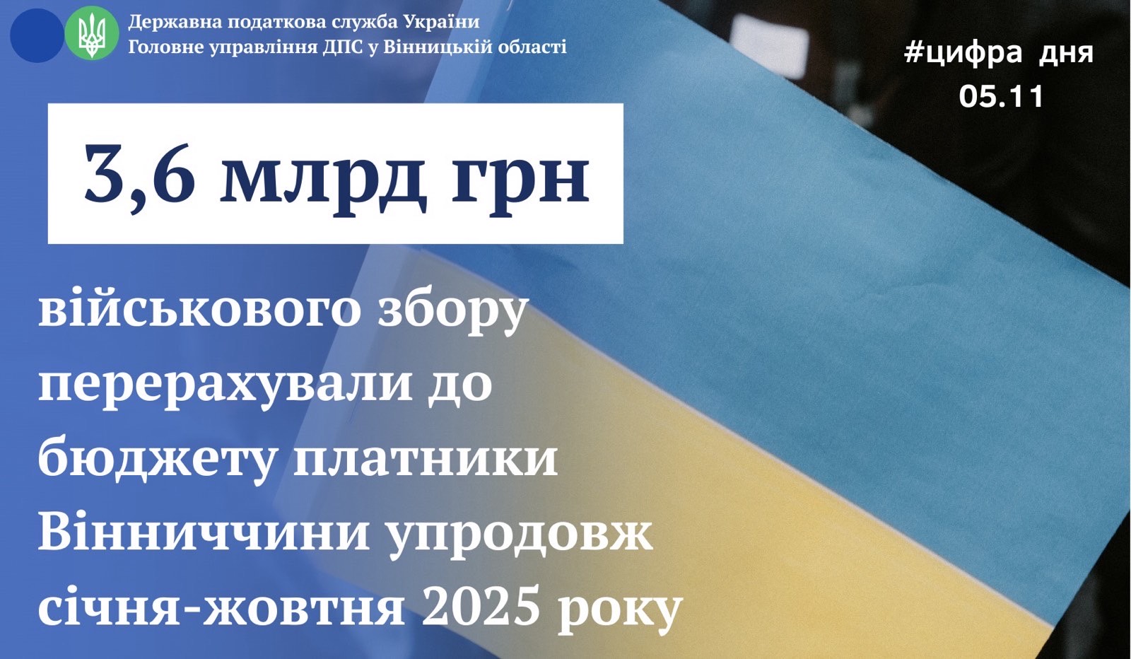 За підсумками січня-жовтня 2025 року на потреби оборони нашої держави Вінниччина перерахувала до державного бюджету більш ніж 3,6 млрд грн військового збору. Про це повідомила начальник ГУ ДПС у Вінницькій області Оксана Домерат.