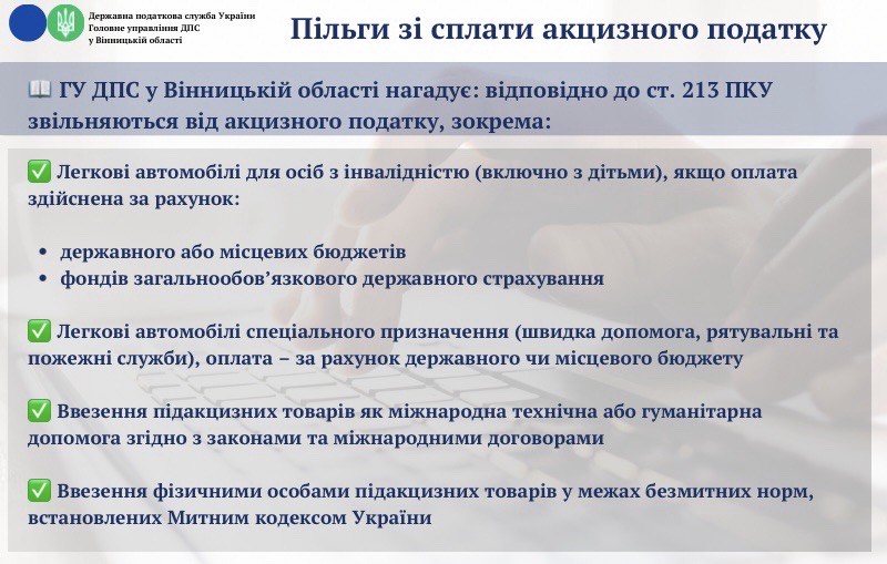 ГУ ДПС у Вінницькій області нагадує, що від оподаткування акцизним податком, відповідно до норм ст. 213 Податкового кодексу України, звільняються, зокрема: