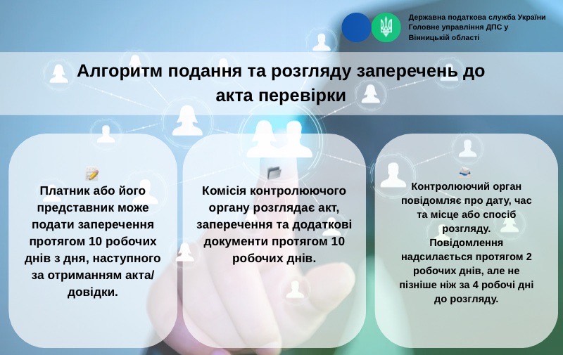 Листівка "Алгоритм подання та розгляду заперечень до акта перевірки"