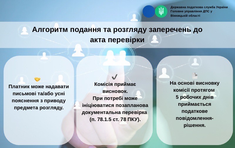 Листівка "Алгоритм подання та розгляду заперечень до акта перевірки".