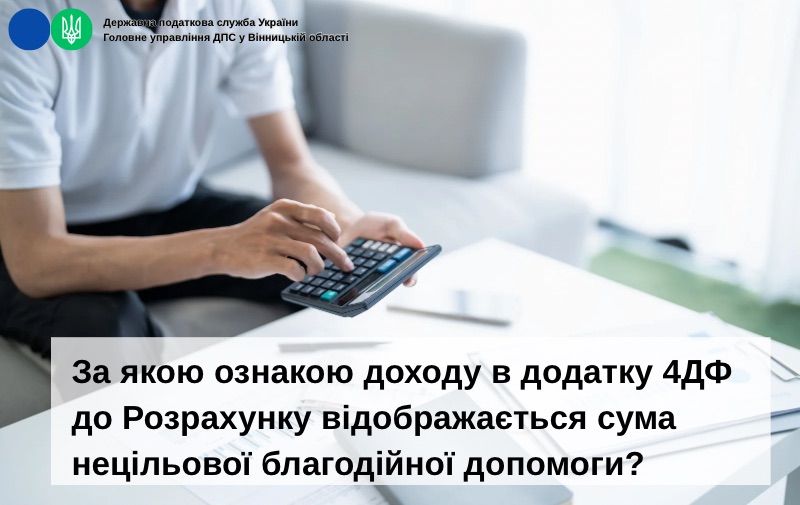 Згідно з Довідником ознак доходів фізичних осіб сума нецільової благодійної допомоги, у тому числі та, що перевищує встановлений граничний розмір, відображається у додатку 4ДФ до Розрахунку за ознакою доходу «169».