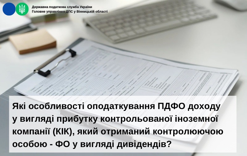 Управління оподаткування фізичних осіб ГУ ДПС у Вінницькій області інформує, що контрольованою іноземною компанією (далі – КІК) визнається будь-яка юридична особа, зареєстрована в іноземній державі або території, яка визнається такою, що знаходиться під контролем фізичної особи – резидента України або юридичної особи – резидента України (далі – контролююча особа) (п.п. 39 прим. 2.1.1 п. 39 прим. 2.1 ст. 39 прим. 2 розд. І Податкового кодексу України від 02 грудня 2010 року № 2755-VI (далі – ПКУ).