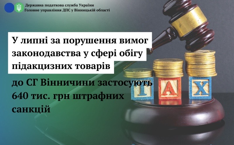 - У липні за порушення вимог законодавства у сфері обігу підакцизних товарів до СГ Вінничини застосують 640 тис. грн штрафних санкцій