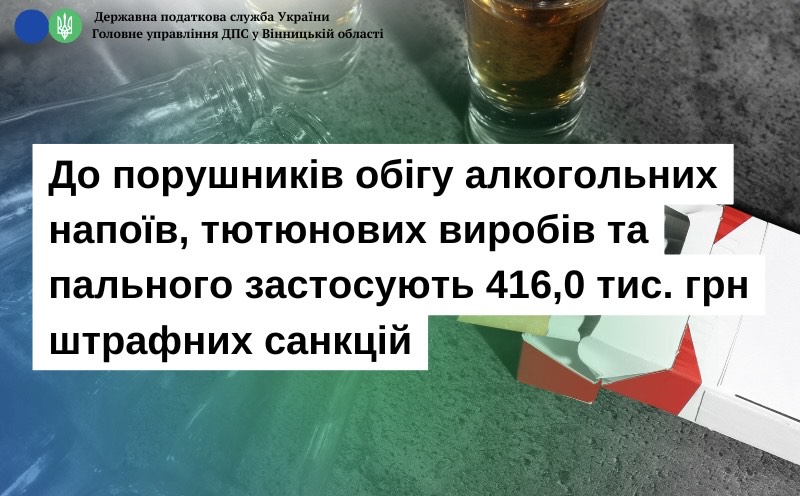 До порушників обігу обігу алкогольних напоїв, тютюнових виробів та пального Вінниччини застосують 416,0 тис. грн штрафних санкцій