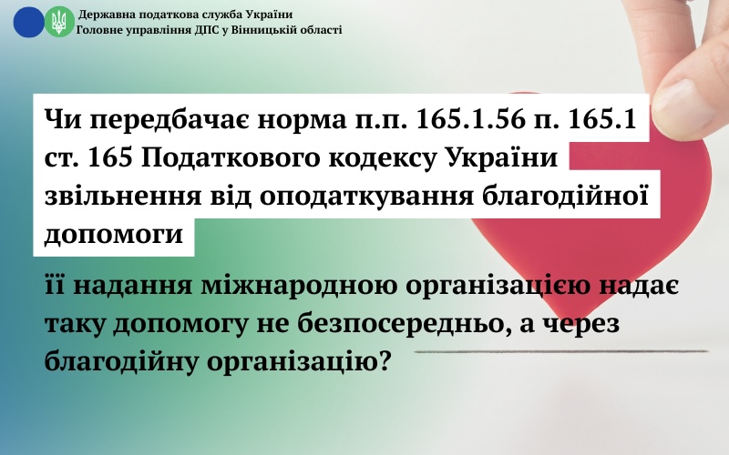 - Чи передбачає норма п.п. 165.1.56 п. 165.1 ст. 165 Податкового кодексу України звільнення від оподаткування благодійної допомоги її надання міжнародною організацією надає таку допомогу не безпосередньо, а через благодійну організацію?