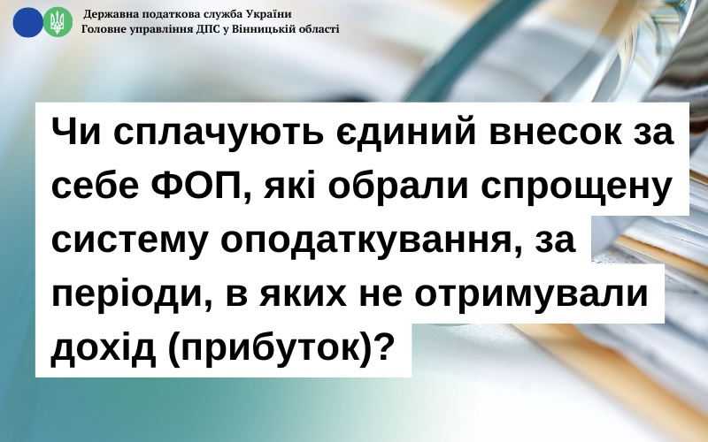 Управління оподаткування фізичних осіб ГУ ДПС у Вінницькій області повідомляє, що відповідно до п. 4 частини першої ст. 4 Закону України від 08 липня 2010 року № 2464-VI «Про збір та облік єдиного внеску на загальнообов’язкове державне соціальне страхування» (далі – Закон № 2464) платниками єдиного внеску на загальнообов’язкове державне соціальне страхування (далі – єдиний внесок) є фізичні особи – підприємці, в тому числі фізичні особи – підприємці, які обрали спрощену систему оподаткування (крім електронних резидентів (е-резидентів).