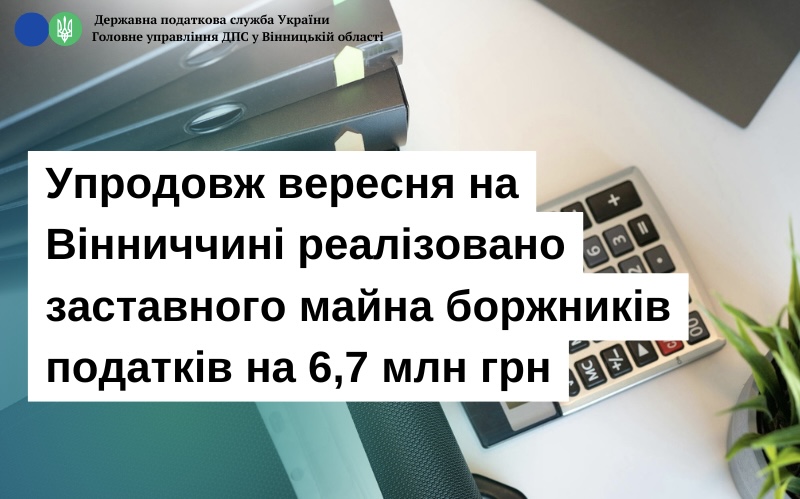 - Упродовж вересня на Вінниччині реалізовано заставного майна боржників податків на 6,7 млн грн