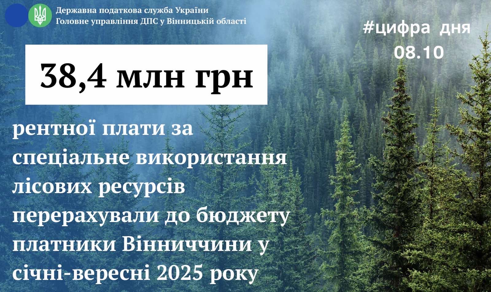 У 2025 році платники податків Вінниччини сплатили до бюджетів всіх рівнів 38 млн 422,1 тис. грн рентної плати за спеціальне використання лісових ресурсів.