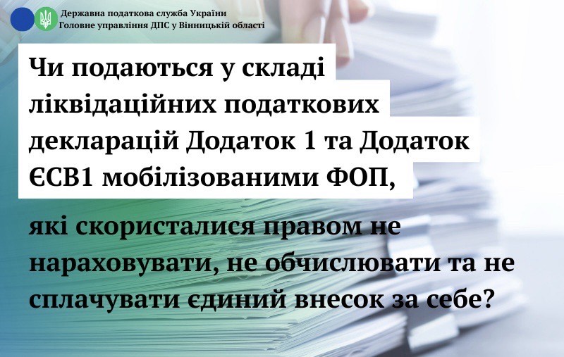 Водночас, у разі припинення підприємницької діяльності мобілізовані фізичні особи – підприємці, які скористалися правом не нараховувати, не обчислювати та не сплачувати єдиний внесок за себе, зобов’язані подати:
