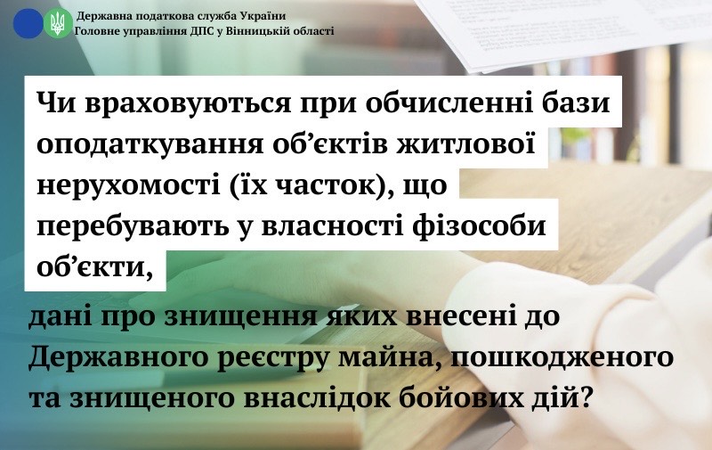 Враховуючи зазначене, об’єкти житлової нерухомості, дані про знищення яких внесені до Реєстру пошкодженого та знищеного майна, враховуються при обчисленні бази оподаткування об’єктів житлової нерухомості, (їх часток), що перебувають у власності фізичної особи, при цьому Податок не нараховується та не сплачується за такі об’єкти житлової нерухомості.