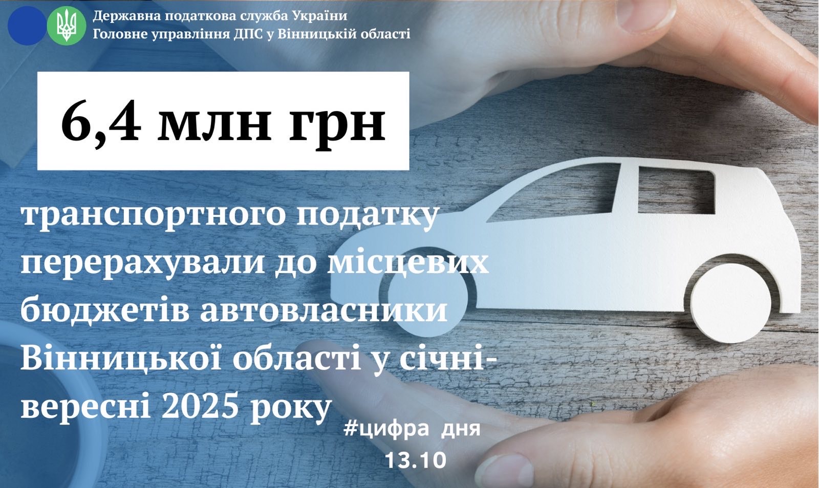 До місцевих бюджетів автовласники Вінницької області у січні-вересні 2025 року перерахували 6,4 млн грн транспортного податку