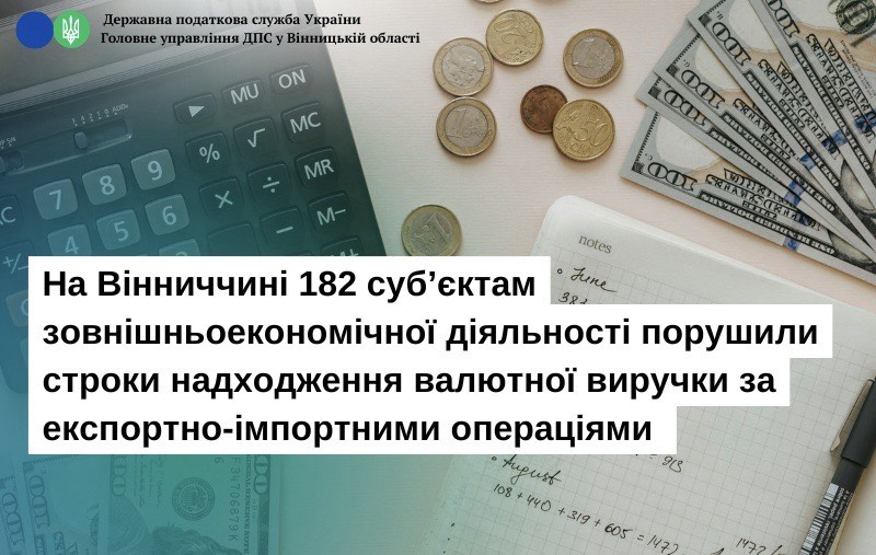 За інформацією управління податкового аудиту ГУ ДПС у Вінницькій області на 01.09.2025 на відпрацюванні у підрозділі перебуває 410 повідомлень Національного банку України про виявлені факти ненадходження в установлені строки валютної виручки за експортно-імпортними операціями по 182 суб’єктам зовнішньоекономічної діяльності.