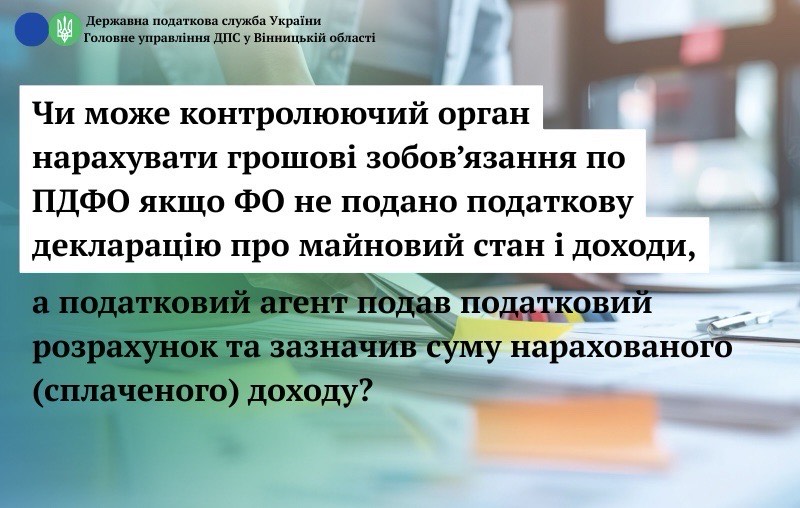 Чи може контролюючий орган нарахувати грошові зобов’язання по ПДФО якщо ФО не подано податкову декларацію про майновий стан і доходи, а податковий агент подав податковий розрахунок та зазначив суму нарахованого (сплаченого) доходу?