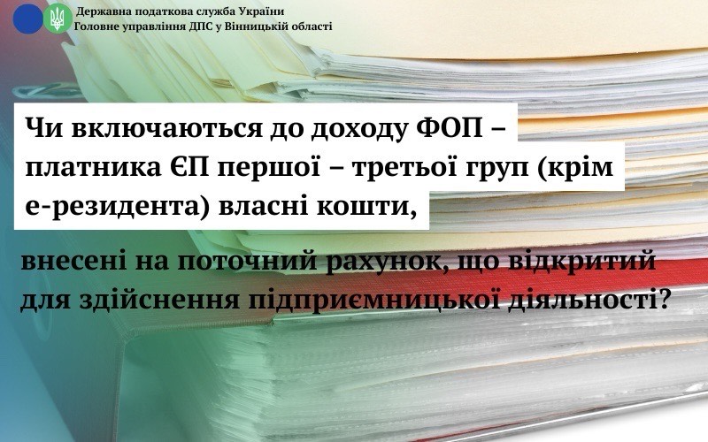 Також слід зазначити, що до доходу фізичної особи – підприємця – платника єдиного податку першої-третьої групи не включаються власні кошти, які внесені на рахунок у банку, відкритий для здійснення підприємницької діяльності, за умови, що такі кошти оподатковувалися під час їх нарахування (виплати) у порядку, визначеному ПКУ, та за наявності документів, які підтверджують сплату податків та зборів, зокрема, але не виключено відомостей з Державного реєстру фізичних осіб – платників податків про джерела та суми нарахованого доходу, нарахованого (перерахованого) податку та військового збору, розрахункових документів тощо.