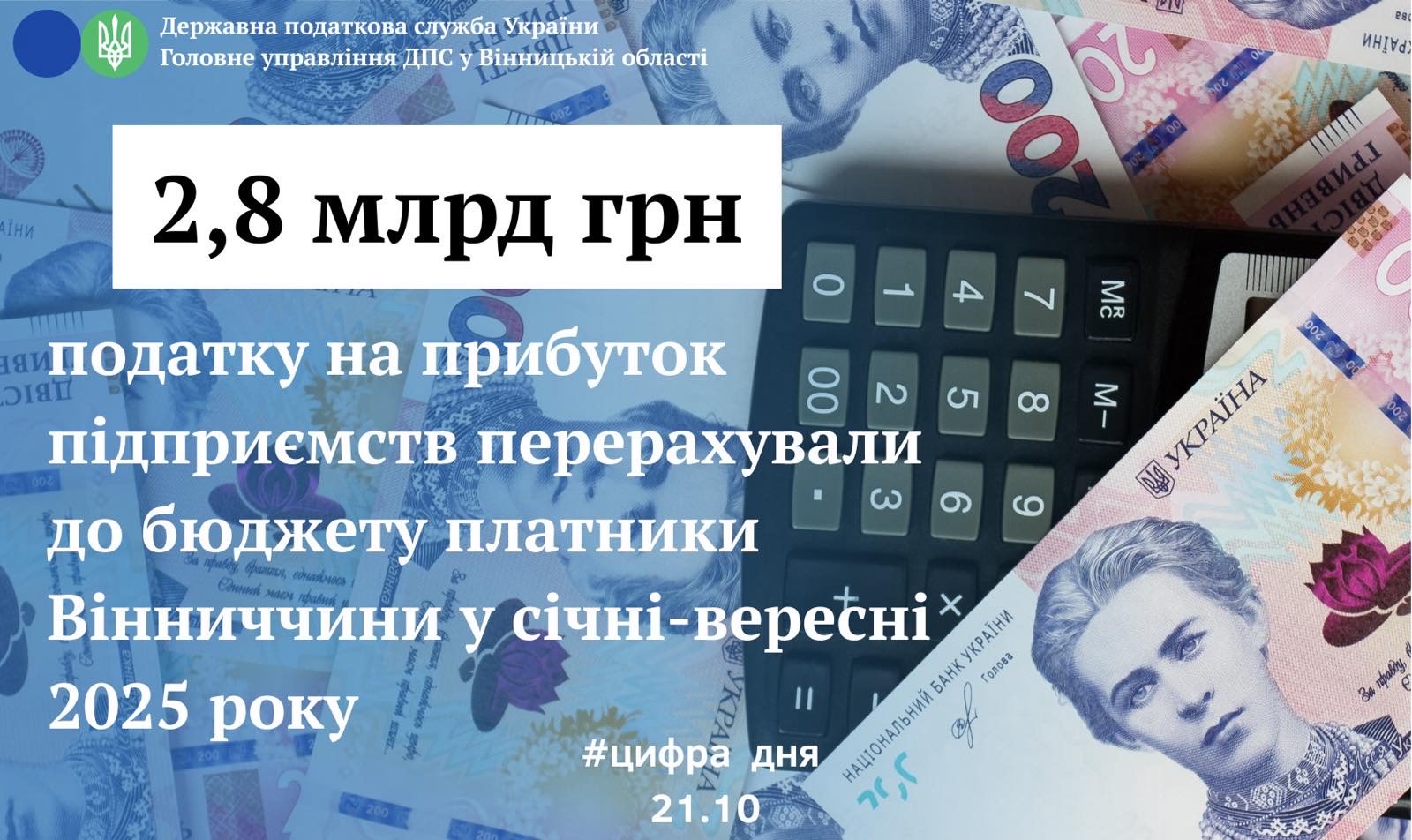 Платники Вінниччини у січні-вересні 2025 року перерахували до бюджету 2,8 млрд грн податку на прибуток підприємств.