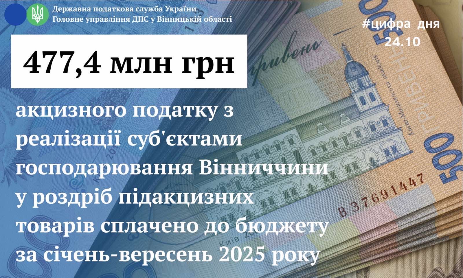 - Суб'єктами господарювання Вінниччини сплачено до бюджету за січень-вересень 2025 року 477,4 млн грн акцизного податку з реалізації у роздріб підакцизних товарів