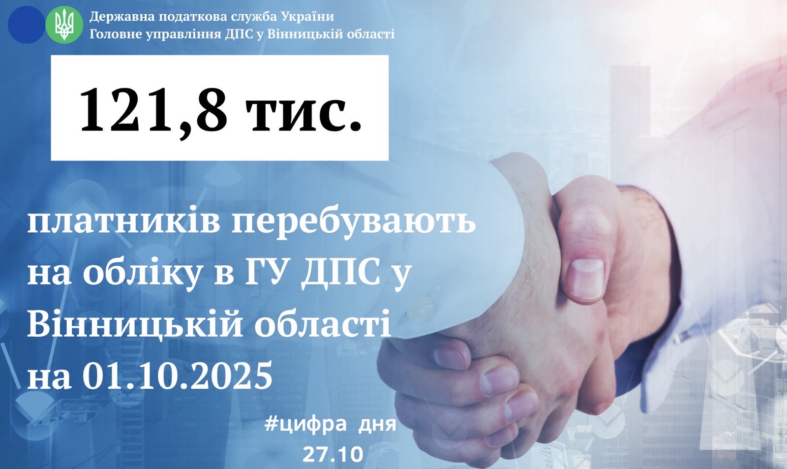 На обліку в ГУ ДПС у Вінницькій області на 01.10.2025 перебувають 121,8 тисяч платників.