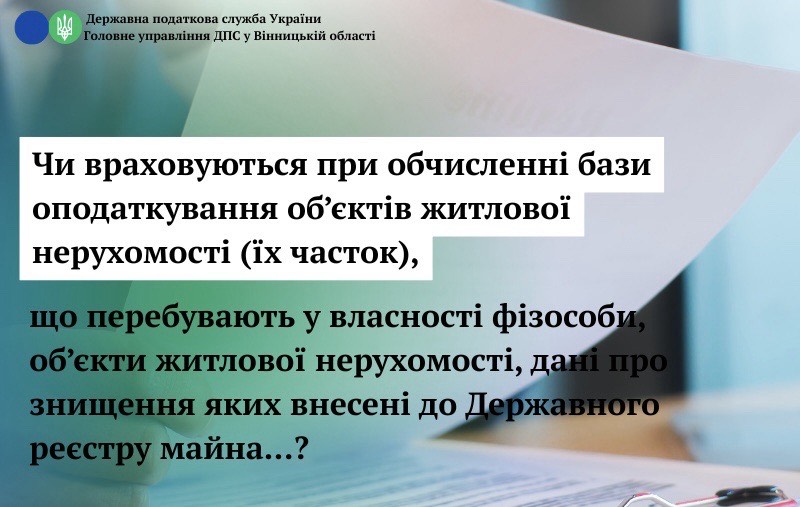 Чи враховуються при обчисленні бази оподаткування об’єктів житлової нерухомості (їх часток), що перебувають у власності фізичної особи, об’єкти житлової нерухомості, дані про знищення яких внесені до Державного реєстру майна, пошкодженого та знищеного внаслідок бойових дій, терористичних актів, диверсій, спричинених збройною агресією російської федерації проти України?