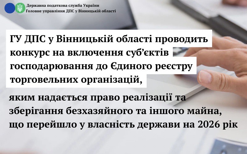 На виконання Постанови Кабінету Міністрів України від 25.08.1998 р. №1340 „Про Порядок обліку, зберігання, оцінки конфіскованого та іншого майна, що переходить у власність держави, і розпорядження ним” Головне управління ДПС  у Вінницькій області проводить конкурс на включення суб’єктів господарювання до Єдиного реєстру торговельних організацій, яким надається право реалізації та зберігання безхазяйного та іншого майна, що перейшло у власність держави на 2026 рік.