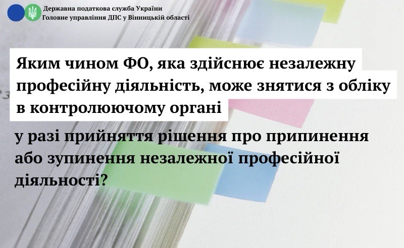 Управління податкових сервісів ГУ ДПС у Вінницькій області інформує, що зняття з обліку фізичної особи, яка здійснювала незалежну професійну діяльність, в контролюючому органі проводиться у порядку, встановленому п. 65.10 ст. 65 та ст. 67 Податкового кодексу України від 02 грудня 2010 року № 2755-VI із змінами і доповненнями (далі – ПКУ), ст. 5 Закону України від 08 липня 2010 року № 2464-VI «Про збір та облік єдиного внеску на загальнообов’язкове державне соціальне страхування» із змінами та доповненнями, розд. V Порядку обліку платників єдиного внеску на загальнообов’язкове державне соціальне страхування, затвердженого наказом Міністерства фінансів України від 24.11.2014 № 1162 «Про затвердження Порядку обліку платників єдиного внеску на загальнообов’язкове державне соціальне страхування та Положення про реєстр страхувальників» із змінами та доповненнями (далі – Порядок № 1162) та розд. ХІ Порядку обліку платників податків і зборів, затвердженого наказом Міністерства фінансів України від 09.12.2011 № 1588 із змінами та доповненнями (далі – Порядок № 1588).