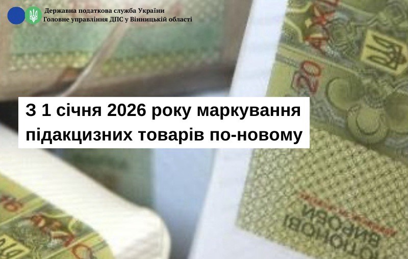 Управління контролю за підакцизними товарами ГУ ДПС у Вінницькій повідомляє, що з 1 січня 2026 року маркування підакцизних товарів здійснюватиметься шляхом нанесення графічного елемента електронної марки акцизного податку, який складається з Датаматрікс-коду (DataMatrix) та елементів, придатних для читання людиною у форматі перших дванадцяти символів унікального ідентифікатора.