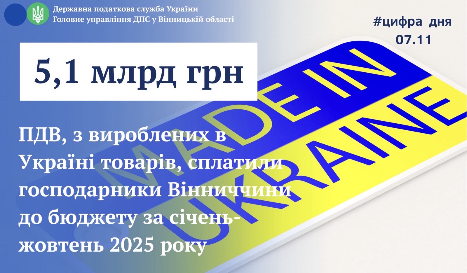 За січень-жовтень 2025 року господарники Вінниччини сплатили до бюджету 5,1 млрд грн ПДВ, з вироблених в Україні товарів.