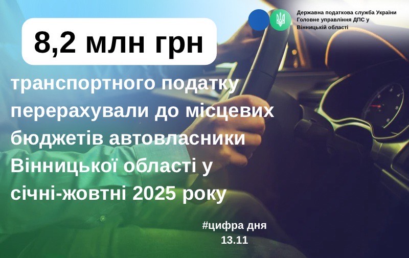 Упродовж січня-жовтня 2025 року за елітні дороговартісні автомобілі платники податків Вінниччини перерахували до бюджетів територіальних громад 8 млн 235,0 тис. грн транспортного податку. Проти минулорічного ця сума зросла на 1 млн 265 тис. грн або на 46,5 відсотків.
