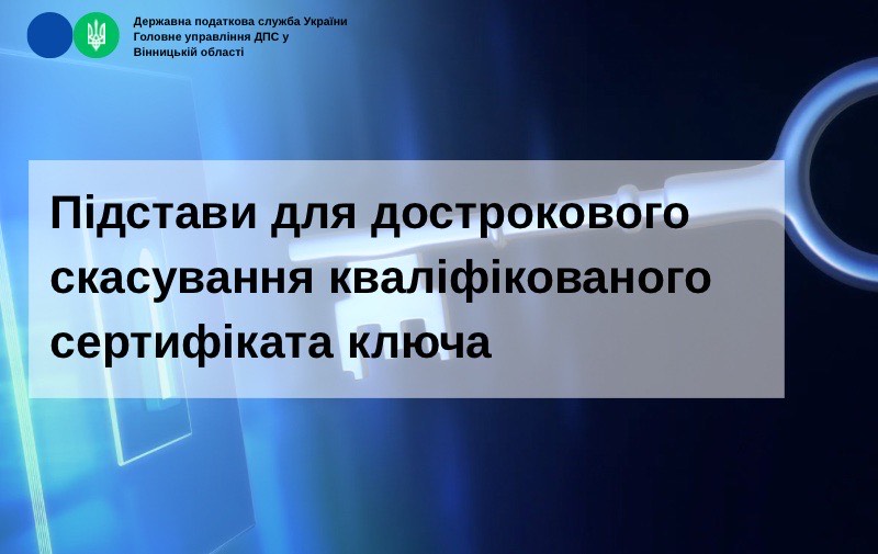 ГУ ДПС у Вінницькій області нагадує, що користувач зобов’язаний невідкладно звернутися до КН ЕДП ІДД ДПС за скасуванням кваліфікованого сертифіката у разі: