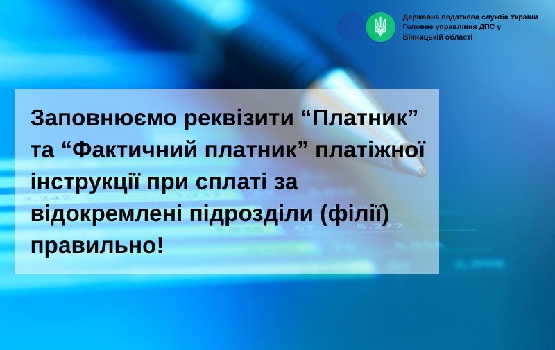 Головне управління ДПС у Вінницькій області звертає увагу, що юридичні особи (далі - головні підприємства) під час сплати податків, зборів, інших платежів та єдиного внеску за відокремлені підрозділи (далі - філії) (у випадках, передбачених Податковим кодексом України) заповнюють усі обов’язкові реквізити платіжної інструкції, у тому числі: