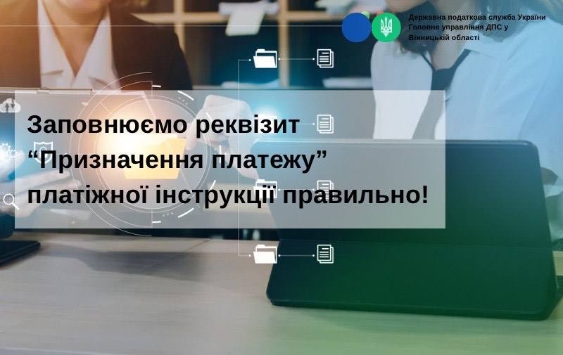 Головне управління ДПС у Вінницькій області нагадує, що з 01.12.2023 впроваджено використання надавачами платіжних послуг виключно структурованого формату реквізиту «Призначення платежу» платіжної інструкції під час сплати (стягнення) податків, зборів, інших платежів та єдиного внеску на загальнообов’язкове державне соціальне страхування.