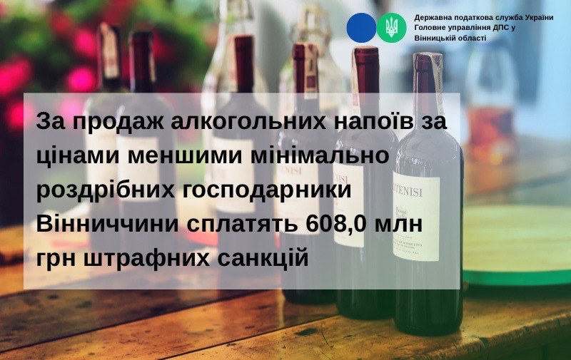 - За продаж алкогольних напоїв за цінами меншими мінімально роздрібних господарники Вінниччини сплатять 608,0 млн грн штрафних санкцій