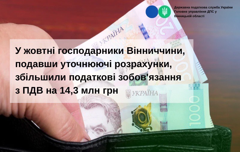 - У жовтні господарники Вінниччини, подавши уточнюючі розрахунки, збільшили податкові зобов'язання з ПДВ на 14,3 млн грн