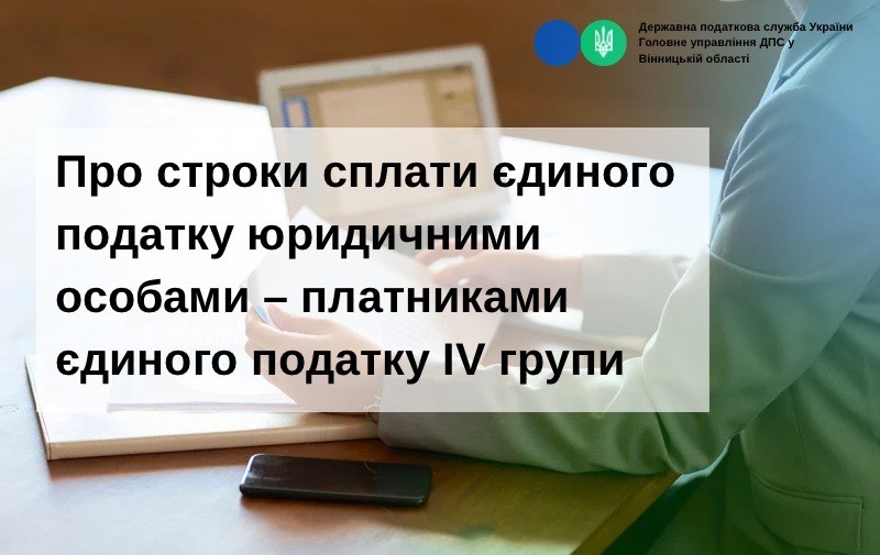 ГУ ДПС у Вінницькій області нагадує, що відповідно до підпункту 295.9.2 пункту 295.9 статті 295 ПКУ платники єдиного податку четвертої групи сплачують податок щоквартально протягом 30 календарних днів, що настають за останнім календарним днем податкового (звітного) кварталу, у таких розмірах: