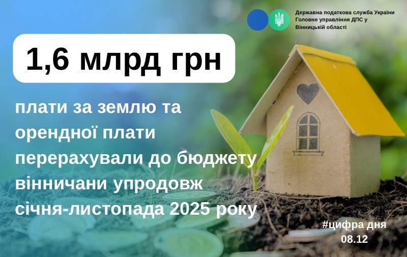 Протягом січня-листопад 2025 року платники Вінниччини перерахували до бюджету 1 млрд 573,4 млн  грн плати за землю. Ці кошти у повному обсязі були зараховані до бюджетів місцевих громад. У порівнянні з аналогічним періодом 2024 року сума надходжень зросла на 20, відсотків або на більш ніж на 269,8 млн грн. Про це під час робочої наради у Вінницькій ОВА інформувала начальника Головного управління ДПС у Вінницькій області Оксана Домерат.