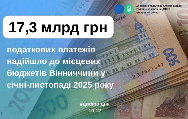 «Проти січня-листопада 2024 року, цьогорічні податкові надходження до місцевих бюджетів Вінниччини зросли на більш ніж 2,5 млрд грн», – повідомила начальник ГУ ДПС у Вінницькій області Оксана Домерат під час зустрічі з бізнесом та громадськістю області. За словами посадовиці, загалом, за рахунок податків, зборів та інших податкових платежів, упродовж 11 місяців 2025 року до бюджетів місцевих громад надійшло понад 17,3 млрд грн.