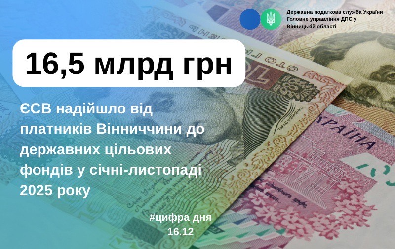 За інформацією начальника Головного управління ДПС у Вінницькій області Оксани Домерат, упродовж січня-листопада 2025 року працедавці Вінниччини перерахували до державних цільових фондів понад 16,5 млрд грн єдиного внеску на загальнообов’язкове державне соціальне страхування.