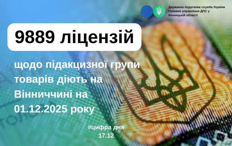 Управління контролю за підакцизними товарами ГУ ДПС у Вінницькій області повідомляє що на 01.12.2025 року на території регіону діє 9 889 ліцензії щодо підакцизної групи товарів. Серед них: