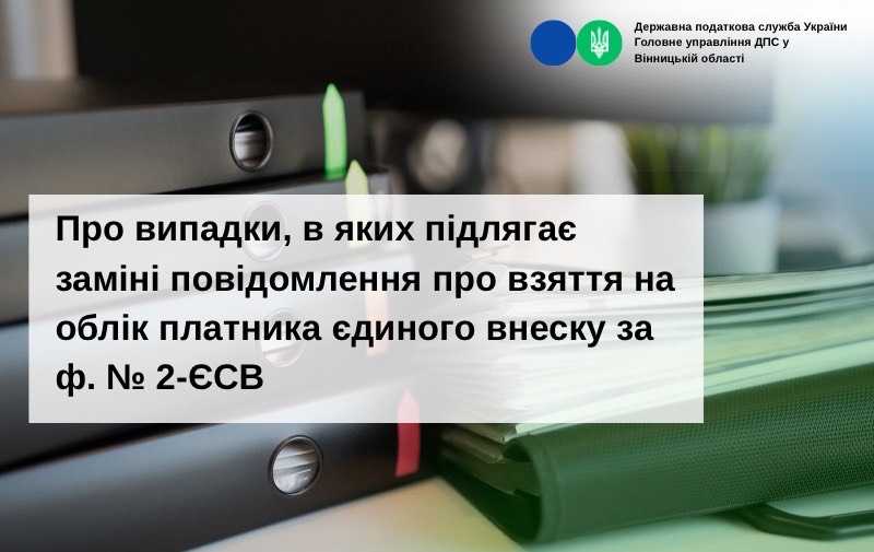 Управління податкових сервісів ГУ ДПС у Вінницькій області інформує, що відповідно до п. 6 розд. ІІІ Порядку обліку платників єдиного внеску на загальнообов’язкове державне соціальне страхування, затвердженого наказом Міністерства фінансів України від 24.11.2014 №1162 із змінами та доповненнями (далі – Порядок №1162) у разі внесення змін до даних, що вказуються у повідомленні про взяття на облік платника єдиного внеску за формою №2-ЄСВ (далі – повідомлення за ф.2-ЄСВ), наведеною у додатку 3 до Порядку №1162 (найменування, прізвище, ім’я, по батькові, місцезнаходження, місце проживання платника єдиного внеску на загальнообов’язкове державне соціальне страхування (далі – єдиний внесок), контролюючого органу, в якому платник єдиного внеску перебуває на обліку тощо), повідомлення за ф. № 2-ЄСВ підлягає заміні у контролюючому органі.