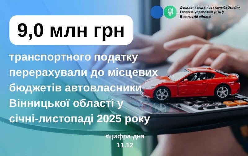 Управління економічного аналізу ГУ ДПС у Вінницькій області інформує, що упродовж січня-листопада 2025 року вінницькі власники елітних автомобілів сплатили до місцевого бюджету майже 9,0 млн грн гривень транспортного податку. Зазначена сума більш ніж на 1,7 млн грн перевищує надходження транспортного податку, отриманого за 11 місяців 2024 року.