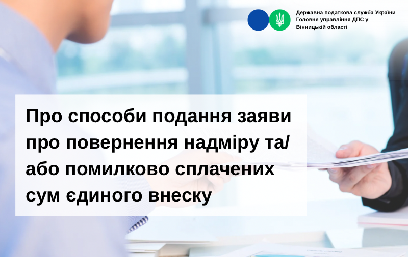 Враховуючи зазначене, Заява подається за місцем обліку надміру та/або помилково сплачених сум єдиного внеску одним із таких способів: