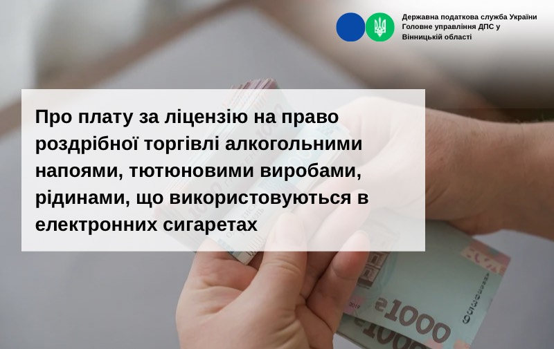 ГУ ДПС у Вінницькій області нагадує, що розмір річної плати за ліцензію на право роздрібної торгівлі алкогольними напоями, тютюновими виробами, рідинами, що використовуються в електронних сигаретах встановлено Законом України «Про державне регулювання виробництва і обігу спирту етилового, спиртових дистилятів, біоетанолу, алкогольних напоїв, тютюнових виробів, тютюнової сировини, рідин, що використовуються в електронних сигаретах, та пального».