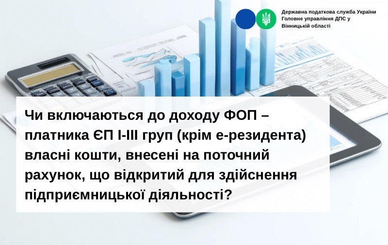 Також слід зазначити, що до доходу фізичної особи – підприємця – платника єдиного податку першої-третьої групи не включаються власні кошти, які внесені на рахунок у банку, відкритий для здійснення підприємницької діяльності, за умови, що такі кошти оподатковувалися під час їх нарахування (виплати) у порядку, визначеному ПКУ, та за наявності документів, які підтверджують сплату податків та зборів, зокрема, але не виключено відомостей з Державного реєстру фізичних осіб – платників податків про джерела та суми нарахованого доходу, нарахованого (перерахованого) податку та військового збору, розрахункових документів тощо.