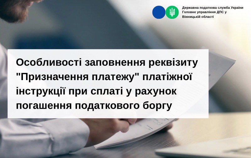 Управління економічного аналізу ГУ ДПС у Вінницькій області нагадує, що у разі самостійного погашення платниками податків заборгованості, заповнення реквізитів “Призначення платежу” платіжних інструкцій здійснюється відповідно до Порядку заповнення реквізиту «Призначення платежу» платіжної інструкції під час сплати (стягнення) податків, зборів, митних, інших платежів, єдиного внеску на загальнообов’язкове державне соціальне страхування, внесення авансових платежів (передоплати), грошової застави, а також у разі їх повернення, затвердженого наказом Міністерства фінансів України від 22.03.2023 №148 (далі - Порядок №148).