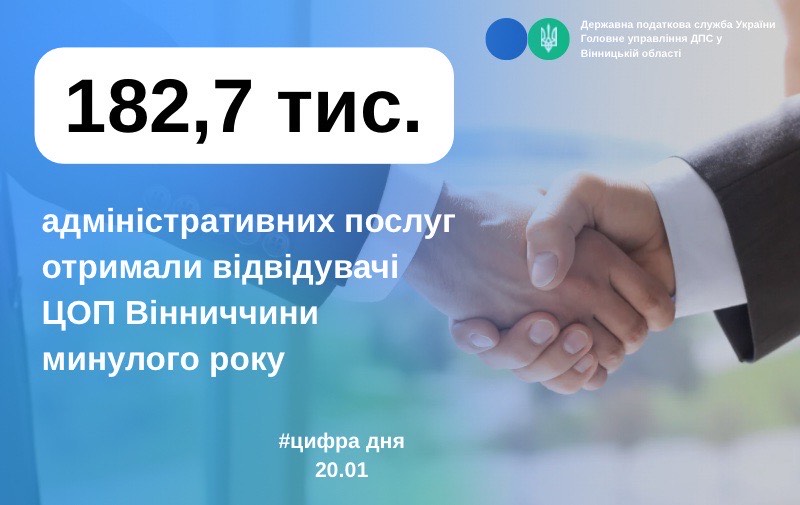 За інформацією управління податкових сервісів ГУ ДПС у Вінницькій області протягом 2025 року відвідувачам Центрів обслуговування платників регіону надано 182,7 тис. адміністративних послуг.