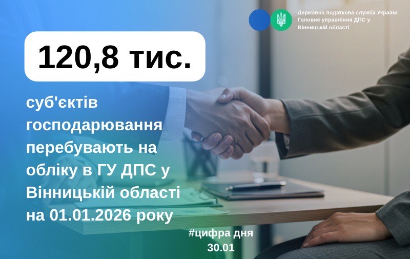 На обліку в ГУ ДПС у Вінницькій області на 01.01.2026 року перебувають 120,8 тис. суб'єктів господарювання