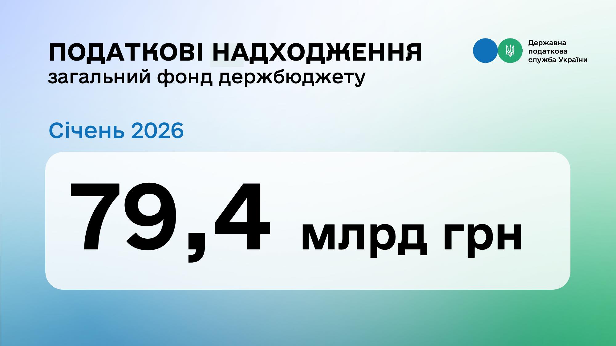 До загального фонду держбюджету у січні 2026 року  надійшло 79,4 млрд грн (91,8% плану) податків та зборів, які контролює ДПС. Про це на своїй сторінці у Facebook повідомила в. о. Голови ДПС Леся Карнаух.
