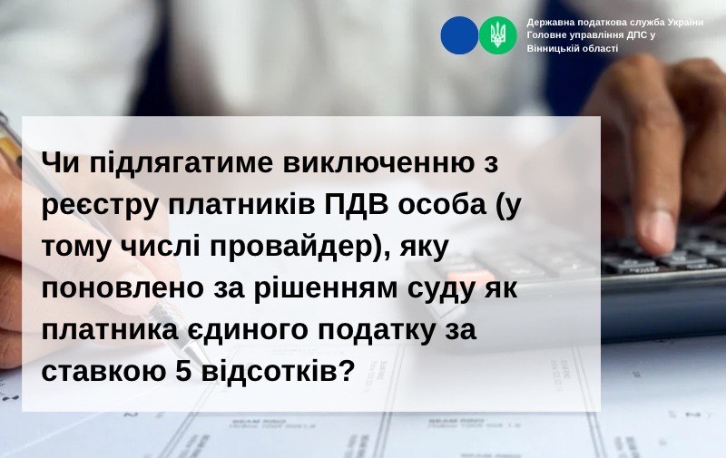 Чи підлягатиме виключенню з реєстру платників ПДВ особа (у тому числі провайдер), яку поновлено за рішенням суду як платника єдиного податку за ставкою 5 відсотків?