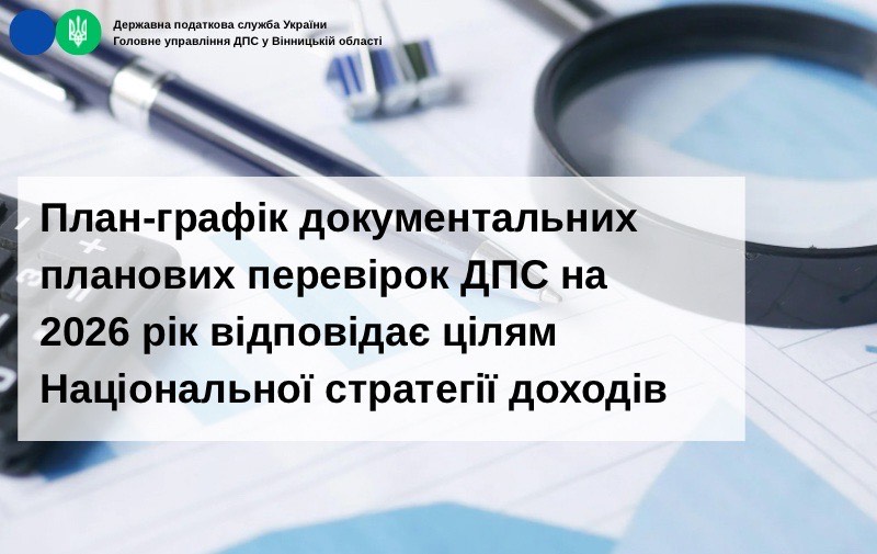 ГУ ДПС у Вінницькій області нагадує, що наприкінці грудня 2025 року ДПС України затвердила план-графік документальних планових перевірок на 2026 рік. До нього включено майже 4,6 тис. суб’єктів господарювання – юридичних осіб та фізичних осіб – підприємців.