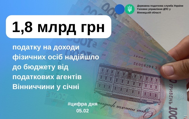 До бюджету від податкових агентів Вінниччини у січні надійшло 1,8 млрд грн податку на доходи фізичних осіб.