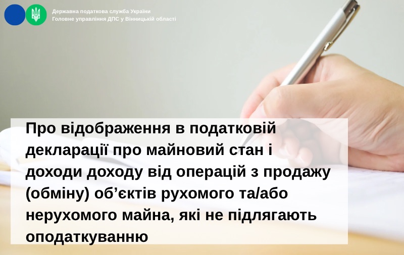ГУ ДПС у Вінницькій області нагадує, що наказом Міністерства фінансів України від 02.10.2015 № 859 із змінами та доповненнями, затверджені Форма податкової декларації про майновий стан і доходи та Інструкція щодо заповнення податкової декларації про майновий стан і доходи. Згідно з п.п. 2 п. 3 розд. ІІІ Інструкції у рядку 11.2 розд. III «Доходи, які не включаються до загального річного оподатковуваного доходу» Декларації вказуються доходи від операцій з продажу (обміну) об’єктів рухомого та/або нерухомого майна, які відповідно до абзацу першого п. 173.2 ст. 173 та п. 172.1 ст. 172 розд. IV Податкового кодексу України від 02 грудня 2010 року № 2755-VI не підлягають оподаткуванню.